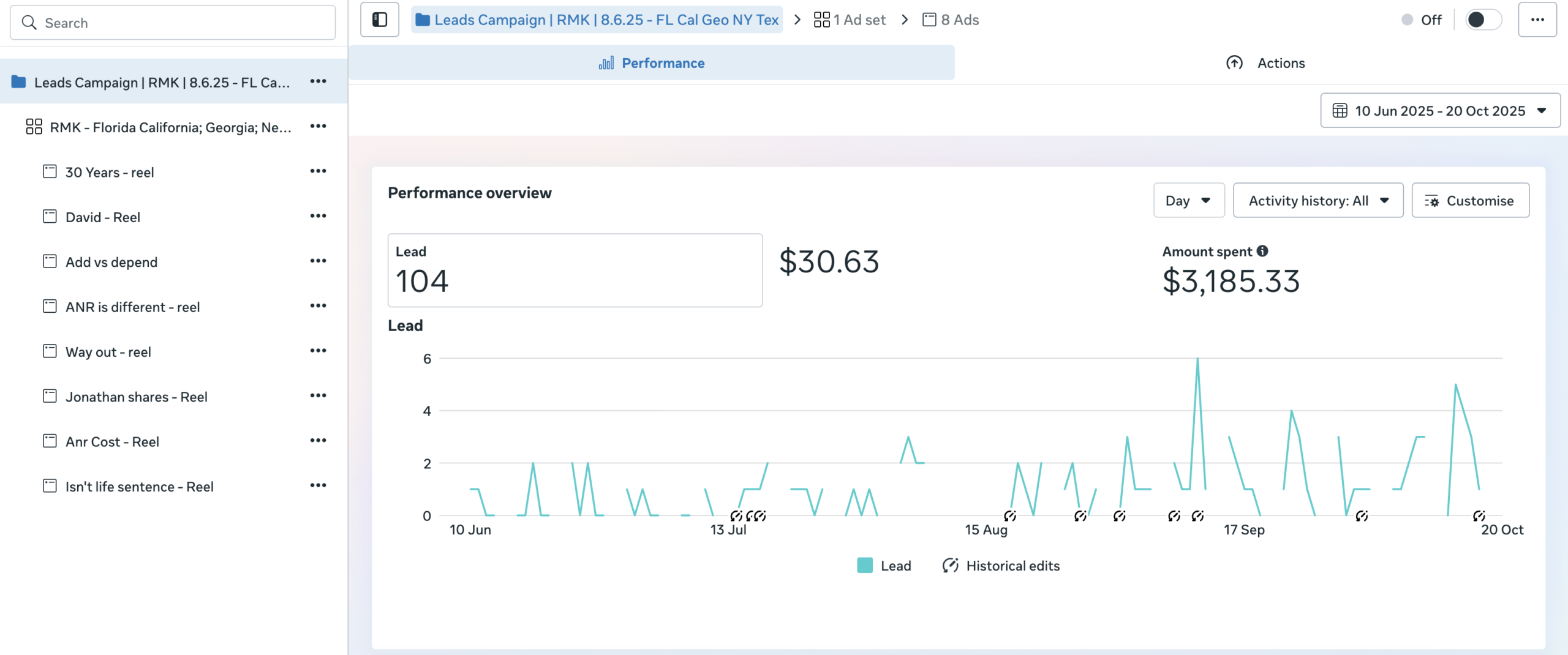 Consistent Efficiency: Regardless of the audience or creative variation, the results were remarkably stable. We generated 180 qualified leads with the cost remaining consistently around $30–$31 per lead across all three major campaigns.