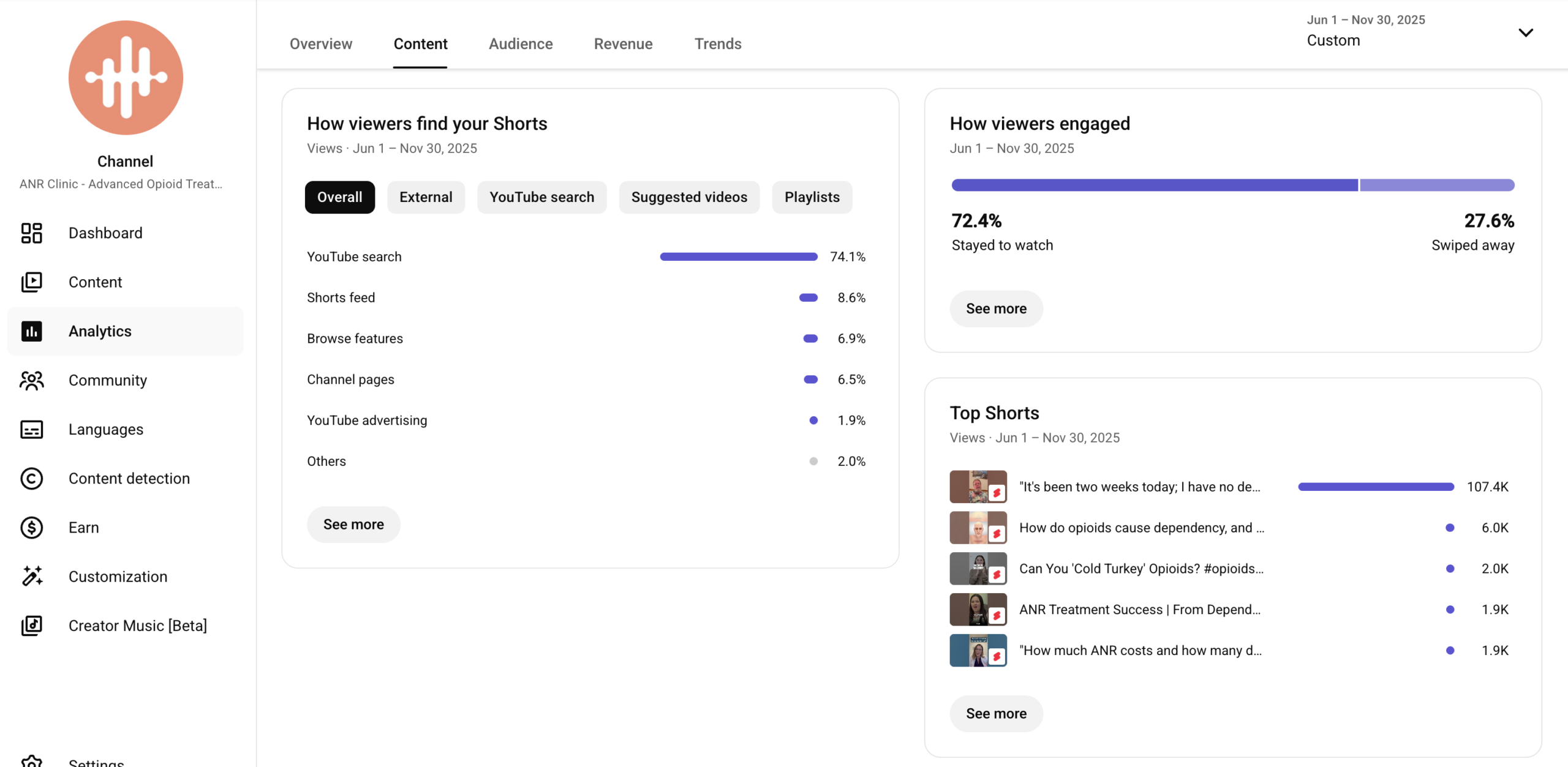 YouTube (The Search & Authority Engine): We managed a dual-strategy focusing on both long-form education and Shorts discovery, delivering 208k total views. Shorts drove massive discovery (154k views) with 74% of traffic coming directly from Search, proving that patients are actively looking for answers. This high-intent viewership resulted in 3,000 hours of watch time and +663 new subscribers.